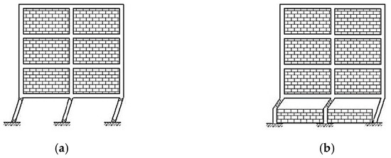 Constructive criticalities are mainly related to the plan and vertical distribution of infill walls. During an earthquake, infills and surrounding frames have a strong interaction, possibly contributing, on one hand, to the (initial) increase in the lateral strength and stiffness when compared to bare frames. However, on the other hand, the infill–frame seismic interaction can lead to local shear failures of structural elements or global failure mechanisms (e.g., soft-story mechanism, Figure 5a), as pointed out in Magenes and Pampanin [22]. Constructive criticalities also include the presence of short columns (Figure 5b) and the absence of measures able to mitigate brittle collapse mechanisms and out-of-plane expulsions.