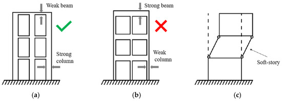 Structural details critical to the seismic response: example of presence (a) and lack (b) of hierarchy of strengths (capacity design) principles; a lack of hierarchy of strengths principles can lead to a soft-story failure mechanism (c).