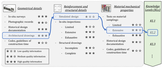 Building knowledge can be grouped into three macro-categories, concerning information on (1) geometric details, (2) reinforcement and structural details, and (3) material mechanical properties. Available material and/or documentation can increase the knowledge in one or more macro-categories depending on the quality of information collected, conceptually represented by one-to-three “stars” (from low to medium to high quality information) in Figure 11. As an example, considering the mechanical material properties, code and/or guidelines of construction time provide basic (i.e., low quality) information (e.g., historical code provisions for concrete compressive strength and steel yield strength), while an exhaustive testing campaign on material samplings provide higher quality information. Finally, by collecting the available material and considering the related quality of information, different knowledge levels can be identified.
