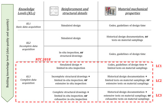 In Figure 12, the Knowledge Levels defined by NTC 2018 (Livelli di Conoscenza, LCs) are also indicated. It can be noted that, for the proposed procedure, the quality of information required by NTC 2018 is deemed as a Complete data acquisition (KL3), since documentation related to both reinforcement/structural details and material properties are needed. The definition provided by NTC 2018 can then be used to identify different sub-classes of knowledge levels within the KL3 class. On the other hand, in Incomplete data acquisition (KL2) and Basic data acquisition (KL1) levels, limited (basic) information is collected in terms of reinforcement/structural details and/or material properties. This is in line with the goals of this research work, aiming to provide a procedure and tool for the seismic assessment of buildings accounting for lack of material and documentation.