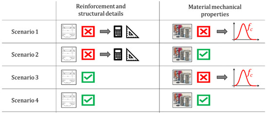 Moving to an incomplete data acquisition level (i.e., Scenario 2 and Scenario 3 in Figure 13), in addition to the information on geometric details and construction period of the building, information on material properties or reinforcement and structural details is collected. As an example, in Scenario 2 it is assumed that tests on material samples and/or historical design documentation, including material properties, are available. Therefore, the quality of data on material properties is improved when compared to Scenario 1. However, a “simulated” design is still required to identify the minimum reinforcement quantities of the structural members. In this scenario, uncertainties can be introduced in a parametric way by considering different configurations, characterized by different bar diameters and anchorage details, as well as different stirrups diameter and spacing for beams, columns, and walls.