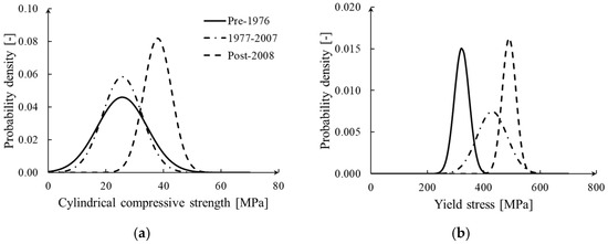 In Scenario 3, it is assumed that no information on the material properties is collected, but structural drawings and/or in situ inspections are available. Therefore, assumptions are needed in order to define material mechanical properties according to the construction period. This can be performed considering the most relevant research works available in literature, providing mechanical properties of typical materials used in the past (e.g., [36,37]). An example of identification of different Italian building classes (Pre-1976, 1977–2007, Post-2008), based on past codes (from Regio Decreto 1939 [38] to NTC 2008 [35]) and accounting for the evolution of structural details and material mechanical properties, can be found in Gentile et al. [39]. Uncertainties can be taken into account by sampling a discrete number of values from the probabilistic distribution of compressive strength and yield strength for concrete and steel, respectively (Figure 14).