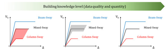 From an alternative and complementary perspective, different-yet realistic in the common practice-scenarios of data collection can be identified through the PELL-School-RS module. In the proposed procedure, the seismic assessment is influenced by the quality and quantity of the available material. If limited or incomplete information is collected, assumptions are needed according to the construction period of the building and referring to codes and guidelines of that time. Moreover, uncertainties on material properties and/or construction details should be introduced following either deterministic/semi-probabilistic (parametric) or probabilistic (mathematical distributions) approaches. An example of different scenarios of data acquisition is conceptually shown in Figure 13.