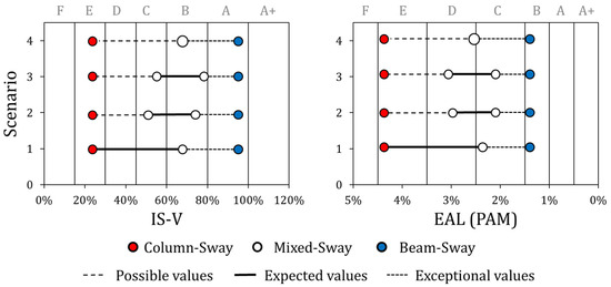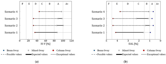 The results of the SLaMA analysis are used to assess the seismic risk class for each case-study scenario, according to the Italian seismic risk classification, exhaustively discussed in the previous sections. The Capacity Spectrum Method [10] is applied in order to assess the building performance at different seismic demand intensity. Then, for each case-study scenarios, possible, expected, and exceptional values of both IS-V and EAL indices are assessed following the procedure explained in the previous sections. Results in terms of both IS-V and EAL indices are shown in Figure 20. Moreover, expected values of both indices are listed in Table 1.