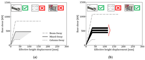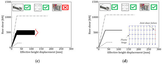 A mixed-sway mechanism (shown in Figure 19d), coupling external beam–columns joint failures with beam failures, characterizes the case-study frame (Scenario 4). As mentioned above, when dealing with limited data collection scenarios (i.e., Scenario 2 and Scenario 3), the proposed multi-knowledge assessment procedure returns a range of possible capacity values/curves (108 and 81 parametric configurations are considered for Scenario 2 and Scenario 3, respectively). Figure 19 also shows the normal (Gaussian) probabilistic distributions of the base shear values. In this case-study example, a higher dispersion is observed for Scenario 2 when compared to Scenario 3. This result is in line with other research studies in literature (e.g., [3,39]), further confirming that the seismic performance of the building is more sensitive to the structural/reinforcement details than to materials properties. On the other hand, it can be noted that no significant modifications are observed in terms of ultimate displacement capacity when comparing the case-study scenarios. This is due to the observed plastic mechanisms, where the ultimate displacement of the structure is limited by the Life Safety deformation capacity of external joints in all scenarios. Finally, due to the high uncertainties affecting Scenario 1, the range of possible capacity values is assumed to be limited by the Column-Sway and Mixed-Sway capacity curves.