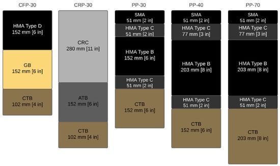 The pavement alternatives were analyzed considering a service life of 50 years, 30 million equivalent single axle loads (MESALs), and a typical Texas climate for the Fort Worth area (TX, USA). The structural packages for the PP, CFP, and CRP designed under these conditions were designated as PP-30, CFP-30, and CRP-30, respectively. It was also desired to evaluate the PPs’ environmental impacts on traffic loading sensitivity. Therefore, the PP structures were assessed for 40 and 70 MESALs traffic loading, denoted as PP-40 and PP-70, respectively [6]. For all the cases, the function unit has deemed a width of 24 ft (7.3 m) and a length of 1 mile (1609 m). Following the previous studies that supported this research [6,9], the pavement alternatives were designed using the flexible pavement design system (FPS), Texas mechanistic-empirical flexible pavement design system (TxME), and AASHTOWare® Pavement M-E Design software. Figure 4 shows these structures. In addition, the subgrade properties (gradation, Atterberg limits, specific gravity, moisture-density curves, Texas triaxial, shear strength, and unconfined compressive strength) employed in the design process can be found in the Texas PP database [6,9,53].