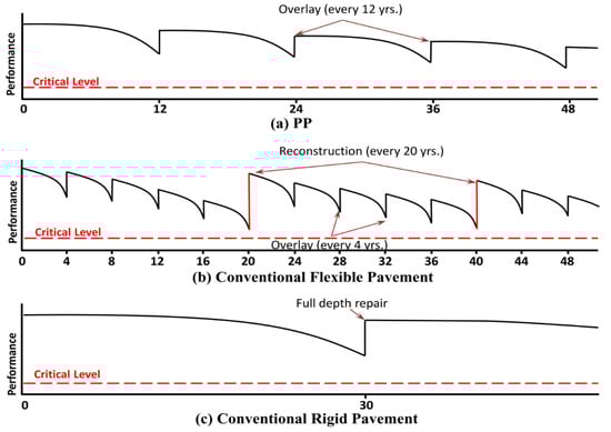 Previous studies by [5,6,9,12] optimized the Texas PP design method from mechanistic and economic perspectives. In these studies, it was demonstrated that for an analysis period of 50 years, the PP structures generated lower life-cycle costs (i.e., higher cost-effectiveness) than both conventional flexible pavements (CFP) and conventional rigid pavements (CRP), respectively. This cost-effectiveness was mainly attributed to the superior mechanical performance of the PP structures, which inherently reduces the required M&R activities. Thus, it ultimately reduces the long-term user and agency costs.