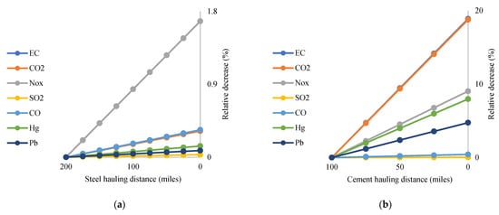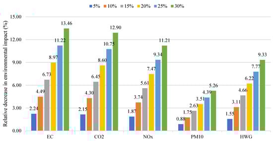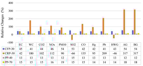 In Figure 6, positive numbers mean that the evaluated pavement alternative has a higher environmental impact (in percentage) than the reference datum (i.e., PP-30). Likewise, negative numbers indicate that the evaluated pavement alternative presents less environmental burden than the reference datum. In this way, the following can be observed: