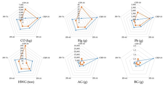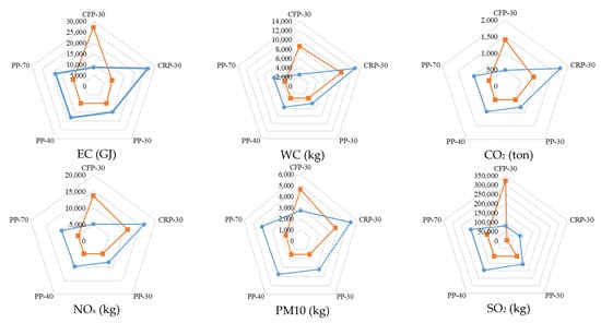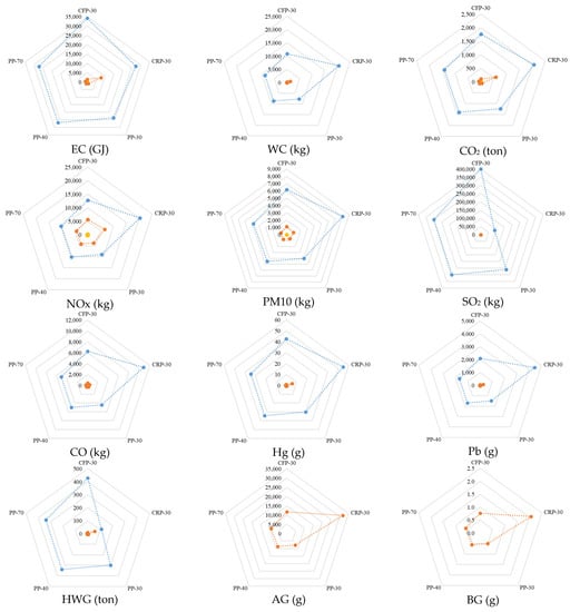 - In the initial construction stage, the PP alternatives were the largest producers of SO2 and HWG. However, in the other ten impact categories, the most significant environmental impact was generated by CRP-30.