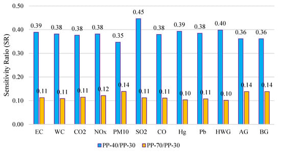A sensitivity analysis was performed to measure how better pavements can be designed and constructed without drastically increasing the environmental impacts. For this purpose, the sensitivity ratio (SR) was determined by varying the traffic design level for the PP structures. The SR is the ratio between the two relative changes and is mathematically computed as expressed in Equation (1) [92]: