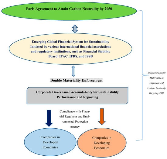 It is imperative to point out that the standard setting and adoption of the emerging global sustainability reporting standard are quite different from those of the conventional financial reporting standard setting by IFRS, largely influenced by the force of globalization for economic prosperity. The novel purpose of this current exercise is driven by the cause of the world’s overall social and environmental sustainability for the well-being of worldwide stakeholders on the planet earth as stipulated under the Paris Agreement. This underlying purpose needs to be embraced in this standard-setting exercise, resulting in the disclosure of relevant sustainability information by salient industries in both developed and developing economies in alignment with carbon neutrality targets under the principle of double materiality [34,35,53,54,55]. While adoption is likely to be made by respective professional accounting bodies in each jurisdiction, compliance requirements would necessarily be enforced by both the financial regulator (e.g., for those listed with local and overseas stock exchanges) and an environmental protection agency within the host country. We articulate an underlying dynamic relationship in global sustainability reporting standard development and the legitimate role of the IFRS Foundation in formulating a common approach within different industries in both developed and developing economies becoming transformed in the direction of sustainability and measurable targets instigated by the global consensus under the Paris Agreement within a proposed holistic framework (see Figure 2).