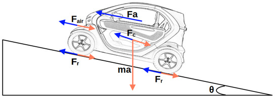 A polynomial power requirement model is used, which takes into account all the forces applied to the vehicle, as depicted in Figure 2. As defined by Equation (1), represents the total force applied to the vehicle, where , , and denote, respectively, the rolling resistance force, the force related to road steepness, the aerodynamic force and the acceleration force.