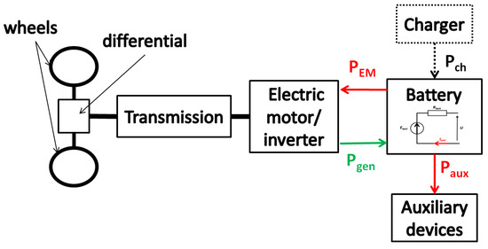 The power to be drowned from the battery is given by Equation (6), where is the total power to be provided by the battery, is the power consumed by the electric motor, is the power consumed by the auxiliary devices, and is the power generated, for instance, from regenerative braking. From Figure 3, there is another electric power, , which is the power needed to charge the battery from an electrical outlet. However, for the simplicity of the proposed model, this power is not included, as it does not have an influence as to when the EV is on the road.