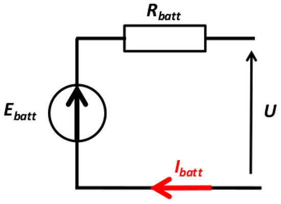 Figure 4 represents the most commonly used battery model. This model consists of a generator with open circuit voltage , and a constant equivalent internal resistance . The current delivered by the battery can be determined using the following equation: