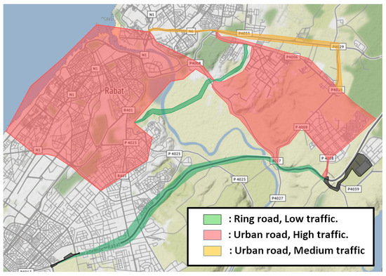 The trajectories in red and orange colors represent urban roads, which are subject to heavy traffic and speed limit of 60 km/h. The difference between the red and orange zones is that the roads in red have two lanes and a lot of traffic lights and speed bumps, whereas the orange road has three lanes with few traffic light and no speed bumps, which results in almost fluid traffic, compared to the red zones. The green zone represents a ring road, which is characterized by medium traffic, speed limit of 80 km/h, no traffic lights or speed bumps and three lanes.