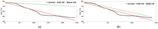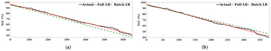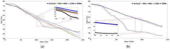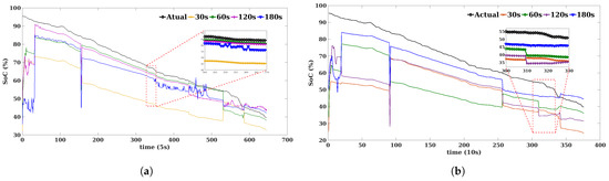 The accuracy of this approach depends mainly on the size of the batch data used to extract the linear equation parameters and the way the data evolve over time. Therefore, for verification, the results of the used algorithm are compared with the results of applying the linear regression upon the whole test dataset. The comparison results are shown in Figure 7 and Figure 8, and the errors are presented in Table 3. From the comparison results, it is clearly seen that the results of using the whole dataset (Full LR) are better than the results of applying the LR upon a batch of data (Batch LR). It is worth noting that determining the suitable batch size is not easy, i.e., having a big batch size might not be useful for the user, as this later might need to wait longer (time to collect batch data) to have the future SoC. However, having a small batch size will let the user have the future SoC instantly, yet this might result in a poor forecast in the long term. In fact, as the battery SoC depends on many factors, the change of the SoC trend might change drastically. Figure 9 shows the relation between the vehicle’s speed and SoC. It is clearly seen that when the vehicle moves at a high speed, the battery SoC decreases rapidly. For instance, Figure 7a shows that the use of the whole test data yields better results than using small batch size, not to mention that the use of a previous drive cycle to generate the LR equation’s parameters is also not suitable due to the fact that the starting point (the initial SoC) for each driving cycle is not the same, which will affect the second parameter of the LR equation (the intercept).