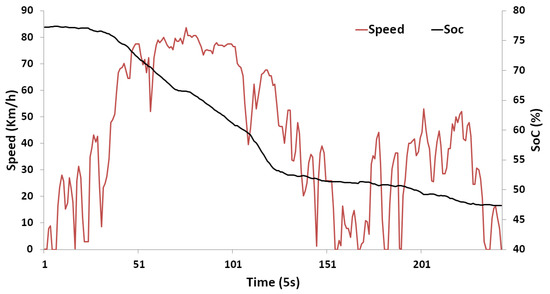 A simplified model of the used vehicle is developed as stated in Section 3. This model takes into consideration the forces that are applied to the vehicle, internal characteristics and the traction motor efficiency cartography. The model expects the vehicle’s speed as the input and outputs the corresponding battery SoC. It is worth noting that because of the simplicity of the used model, it is easy to use the proposed method with other types of electric vehicles. Furthermore, the used internal parameters are almost all available and can be obtained from the manufacturer datasheet of the vehicle. Additionally, the proposed model is suitable for being integrated in in-vehicle embedded systems due to its low computational power.