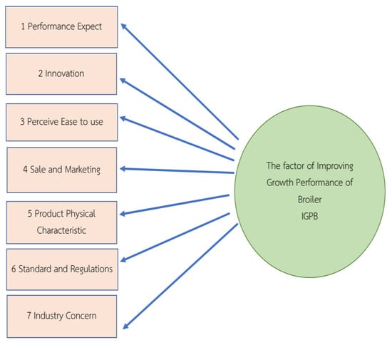From Figure 1 and Table 4, the composition’s factor loading of the innovative product for improving the growth performance of broilers (IGPB) can be arranged in descending order: performance expectation (PE), innovativeness (IN), perceived ease of use (PEOU), sales and marketing (SM), product physical characteristics (PC), standards and regulations (SR), and industry concerns (IC), with the element weight in the form of a standard score of 0.91, 0.89, 0.79, 0.73, 0.63, 0.50, and 0.36, respectively, which has a statistically significant weight at the 0.001 level. Moreover, there is a variance with the factor component to increase the growth performance of broilers (IGPB) by 83%, 79, 63, 53, 40, 25, and 12, respectively.
