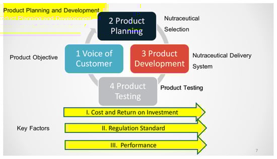 Step 3 involves product development and technology identification. For this step, the product prototype is designed by taking the product characteristics identified in the product planning and technology stage into consideration [45]. The last step (step 4) is the product testing stage, to evaluate the success of product development, as shown in Figure 2 [46]. The production performance should excel compared to other products in the group, and the Salmonella spp. detection test should be negative. Ideally, the farmers would also gain more benefits from developed product value-added features, such as increasing the carcass quality to meet the market demand. The final process comprises management guidelines and offers suggestions to make a better product for both the customer and the supplier via the intellectual property management system [47]. This product planning and innovation tool allows users to utilize its systematic thinking skills; it is designed to work in a cycle that can go back and forth instead of using a one-way method [12]. The users may innovate the product in terms of every factor shown in Figure 2. The developed product will address the future problems that could arise and maximize the benefits for consumers, farmers, social response, governance process, and livestock. Moreover, this tool could facilitate management efficiency, as it is focused on the product’s unique market challenges, raw materials selection process, and the customers’ response.