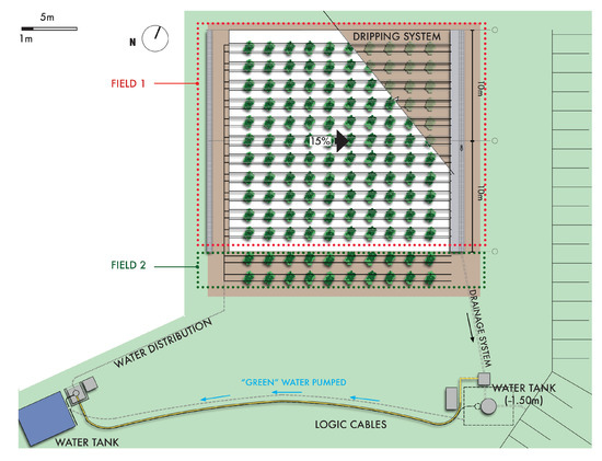 The rainwater collected by the membrane was gravity-drained and stored in an underground tank. This water was pumped to a tank about 1.5 m higher and later distributed by dripping. In addition, the field had sensors for water flow monitoring and the automation systems. All methodological details are described in the inventory analysis in Section 2.2.