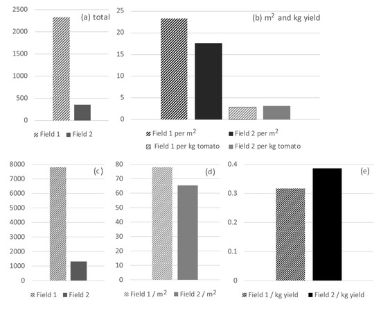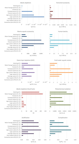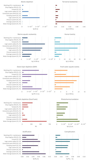 In LCA studies, the functional unit is the reference basis for measuring products, services, and activities, while the reference flow is the amount of activity or product required to achieve the functional unit [34]. The functional unit here is expressed by area (in m), attributing hotspots to the components for one kg of fresh tomato, enabling comparison in terms of productivity. Gaillard et al. listed twelve studies using two functional units for agricultural systems [17].