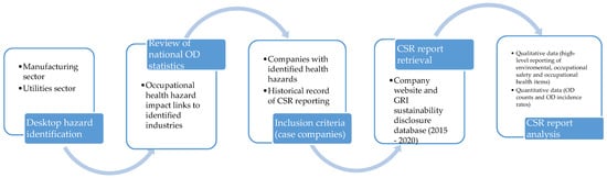 The search strategy adopted for this study is shown in Figure 1. As a departure point, a desktop hazard identification study was conducted through the analysis of the United States’ National Institute of Occupational Safety and Health’s (NIOSH) Health Hazard Evaluation (HHE) reports, to establish and link specific industry types within the manufacturing and utilities sectors with specific inherent occupational health hazards. No similar repository to the United States’ NIOSH HHE currently exists in South Africa. In turn, the extent of exposure to the identified occupational health hazards is reflected in compensated ODs on a national level and OD incidence at a company level. The results of the desktop hazard identification study have been previously reported in Rikhotso, Morodi [56], where companies operating in the steel, automotive, food, utilities, pulp and paper, cement, and petroleum manufacturing were found to have inherent occupational health hazards with varying exposure levels. Examples of specific occupational health hazards from the included case companies are shown in Table 1. The outcome of the desktop hazard identification study informed the purposive selection of companies included in this current study in view of prevailing occupational health hazards. In this regard, companies within the South African manufacturing, utilities and similar sectors operating in the same industry type as those identified in the desktop hazard identification study were purposely selected, as shown in Table 1.