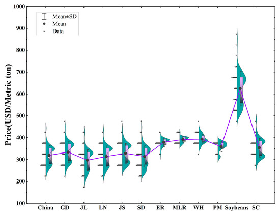 Agricultural products and futures price data. (The left is the scatter distribution of data, the right is the half violin in the form of density distribution, the top of the half violin is the maximum value, the bottom is the minimum value, the middle solid circle is the average value, the inner box represents 25–75% of the data, the upper and lower line of the box represent the next standard deviation of the mean value, and the purple broken line is the mean line of different groups).
