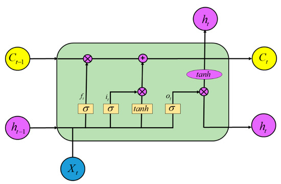 Among them, “gate” is the key technology of the LSTM model. By controlling the input, storage, and output of the data, LSTM can deal with the problems such as long-term dependence and gradient explosion [50]. The detailed formula is given by the following equation: