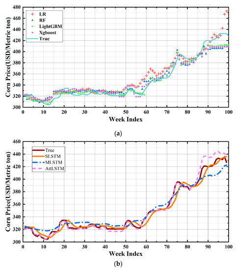 Among the predictive regression models, RF, LightGBM, and XGBoost models can only show high accuracy when prices are changing mildly, whereas the LR model can give precise predictions when prices are just started to bounce. In the single LSTM model, the problem of hysteresis quality will appear in the prediction results. AttLSTM can improve the accuracy of the prediction results, but the prediction result is still not perfect when the price bounces. Because of the smallest error values and the largest , the AttLSTM-ARIMA-BP model can accurately predict the price of corn in Sichuan Province whether the price is a steady change or a dramatic fluctuation. Moreover, this model will have a broader application and development prospect in the research of time series data.