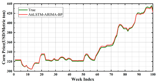 Given that the ARIMA model can only predict linear relationships in prices, and the further the target is from the historical data, the worse the prediction is. To completely solve the problem of hysteresis quality, we input the predicted values obtained from the ARIMA model and the residuals obtained from the LSTM model in the BP model. Since the past price always affects the current price, we also select the three columns with the maximum weights in Figure 7 to research the corn price in Sichuan Province, namely the price of corn in Guangdong Province 12 weeks ago, the price of corn in Guangdong Province 11 weeks ago, and the price of corn in Jilin Province 2 weeks ago. Through the BP model training the predicted value obtained by ARIMA, the residual value obtained by LSTM training, and the three sets of data with the highest weight obtained by the attention mechanism, the price of corn in Sichuan Province is predicted. We divide the prediction results of the model into five parts, each of which has 20 groups of data. Then, we calculate the MAE value of each par, respectively, and sort the error value into Table 4. By judging the fitting degree in Figure 8 and analyzing the MAE score in Table 4, we conclude that the AttLSTM-ARIMA-BP model can accurately predict the corn price in Sichuan Province, whether the price changes steadily or the price fluctuates by leaps and bounds.