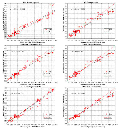 In the predictive regression model, we respectively use LR, RF, XGBoost, and LightGBM models to study corn prices in Sichuan Province, where RF, XGBoost, and LightGBM models are predictive regression models in ensemble learning [58]. The experimental results are shown in Figure 6a, where the red, blue, green, and purple dots represent the predicted values of the LR, RF, LightGBM, and XGBoost models, respectively.
