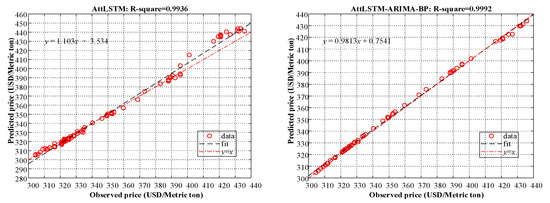 As can be seen in Figure 9, no matter which error calculation method that we adopted, the AttLSTM-ARIMA-BP model recorded the smallest error value, where the MAPE was 0.0043, the MAE was 1.51, and the RMSE was 1.642, whereas the ensemble learning recorded the largest error value. In Figure 10, we set the horizontal coordinates to the true value of corn prices in Sichuan Province and the vertical coordinates to the predicted value, fitted the curve from the scatter plot, and calculated the value of the coefficient of determination . By comparison, the AttLSTM-ARIMA-BP model has the highest , which is 0.9992.