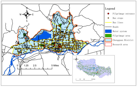 The data source for this paper is based on data obtained from the research on the life of pilgrims, pilgrimage areas, and bus routes in Lhasa during the period from March 2021 to June 2022. During the survey period, the number of new patients with COVID-19 in Lhasa was zero. Therefore, for the investigation data and public transport information used in this paper, there is no need to consider the impact of the COVID-19 pandemic. According to the bus lines in Lhasa, by the end of 2021, there are 38 bus lines in the Chengguan District of Lhasa. At the same time, Lhasa, as the holy city of Tibetan Buddhism, is a typical pilgrimage city. Therefore, Lhasa was selected to measure the time accessibility of public transport travel of pilgrims and both measure and analyze the spatial fairness of each traffic zone.