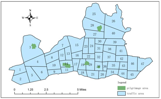 During the division of the transportation community in the Chengguan District of Lhasa city, the overall planning of Lhasa city was fully considered. Combined with the regional economic development within the scope of the study, the division of the pilgrimage transportation community can coordinate the current situation of bus operation and the basic distribution of the pilgrimage population in the study area as much as possible. The study area is divided into 47 traffic districts, the specific distribution of which is shown in Figure 3.