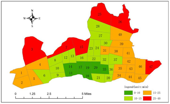 After visualizing the time accessibility index of each traffic zone of Lhasa in ArcGIS, the classification display standard was calibrated. The index range was divided into traffic community accessibility grades of 0–10 min, 10–15 min, 15–20 min, and 25–40 min, corresponding to better, good, general, and poor traffic communities, respectively. The overall time accessibility distribution map of the Lhasa pilgrimage traffic community was drawn (as shown in Figure 5).