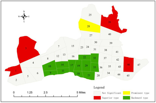 According to the accessibility data of traffic zones, the global clustering index of bus time accessibility of 47 traffic zones in Lhasa was calculated in the ArcGIS spatial statistical tool. The Moran’s I value is 0.487, the Z value is 5.615, and the p value is less than 0.01. The global clustering test results showed that the time accessibility of traffic zones in Chengguan District has a significant positive spatial correlation. Based on this, the local autocorrelation evaluation results are used to divide the resource allocation balance types of traffic zones in the study area into three types of areas: superior type, backward type, and prominent type (as shown in Figure 6).