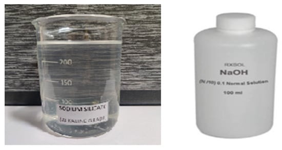 The alkaline liquid used was a combination of sodium silicate solution and sodium hydroxide solution, as shown in Figure 1. The sodium silicate solution (Na2O = 13.7%, SiO2 = 29.4%, and water = 55.9% by mass) was purchased from a local supplier in bulk. The sodium hydroxide (NaOH) in flakes or pellets with 97–98% purity was also purchased from a local supplier in bulk. The NaOH solids were dissolved in water to make the solution. The combination of NaOH and Na2SiO3 was used as alkaline solution. The ratio of both solutions, alkaline to fly ash, was taken as 0.35. Ordinary tap water used for drinking purposes was used for the preparation of concrete mixes.