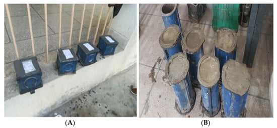 (A) Casted concrete cubes with or without geopolymer materials; (B) casted concrete cylinders with or without glass fiber material.