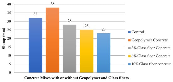 The workability test on all the concrete samples was performed by slump cone apparatus as per ASTMC143/C143M [65]. From the workability test, it was revealed that the workability of concrete having geopolymer was better than ordinary Portland cement concrete. The reason for the good workability was the fluidity of geopolymer concrete because of alkaline media of NaOH and Na2SiO3. The combination of water and alkaline liquid caused fresh concrete to become a workable mix; hence, the placement and finishing of geopolymer concrete was better than ordinary Portland cement concrete. On the other hand, the workability of glass fiber concrete reduced with increasing the content of glass fibers; this is because glass fiber concrete had less fluidity and free water as compared to ordinary concrete and concrete having geopolymer material. The results of workability are presented in Figure 3.