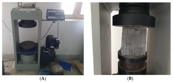 The compressive strength test on all the concrete cubes was performed as per ASTMC39/C39M [66]. A compression testing machine of 3000 kN capacity was used for the compressive strength testing of concrete cubes and cylinders, as shown in Figure 4.