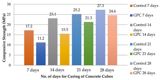 The results of the compressive strength test of all the concrete cubes with or without geopolymer material are shown in Figure 5. From the test results, it was concluded that concrete having geopolymer material had lesser compressive strength than ordinary Portland cement concrete. The reason for the reduced strength of geopolymer concrete was more fluidity, the presence of super plasticizer SP-675, and water curing of geopolymer concrete. The concrete having geopolymer and super plasticizer SP-675 was a more workable mix than ordinary Portland cement concrete having no super plasticizer. More workability leads to decreased strength of concrete. The second reason for the decreased strength was the water curing of geopolymer concrete. Water curing has less of an effect on the strength development of geopolymer concrete as compared to ordinary Portland cement concrete [15].