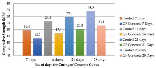 The compressive strength values of concrete cubes with or without glass fibers are presented in Figure 6. From Figure 6, it was concluded that the compressive strength of concrete decreased with an increase in the quantity of glass fibers, and the strength was minimum at 10% glass fiber content. The reason for the decrease in compressive strength of concrete with increasing glass fiber content is the lack of workability due to the higher surface area, which causes resistance to the flow of concrete. The optimum percentage of glass fibers for improved strength is 2% [68].