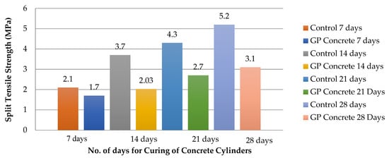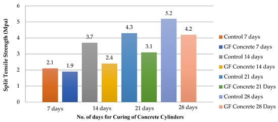 - The split tensile strength values of concrete having geopolymer and glass fibers also decreased with an increase in the amount of geopolymer and glass fiber content in concrete. The optimum value of glass fiber in concrete is 1.5% for the improvement in the flexural strength of concrete [68]. The nature of curing also has a significant effect on the split tensile strength of concrete, and oven curing is preferred over water curing [19].