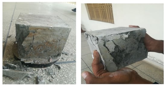 Failure pattern of geopolymer and glass fiber concrete cubes after compression test.
