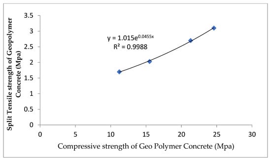 From Figure 12, a relationship was developed between compressive strength and split tensile strength values of geopolymer concrete as shown in Equation (1). The value of R2 is 0.998.