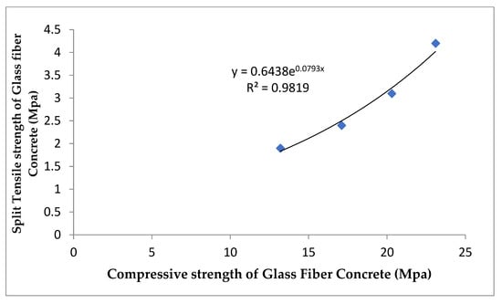 On the basis of the strength values obtained from two types of tests, different regression models have been developed between compressive strength and split tensile strength values of concrete having geopolymer material and glass fiber materials, as shown in Figure 12 and Figure 13, respectively.