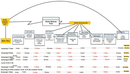 The waste material flow consists of ten activities presented with the time taken in Figure 3. All these activities are classified into three categories, i.e., value-adding, non-value-adding and necessary but non-value-adding.