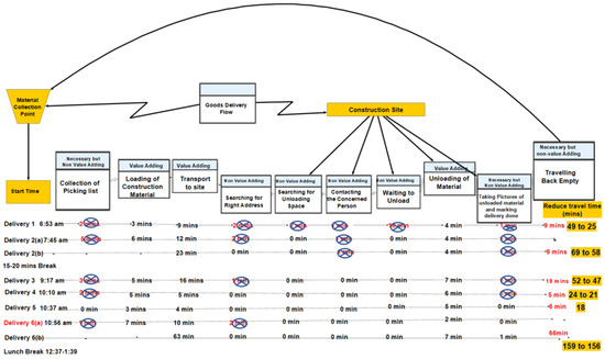With the help of these suggested solutions, transport planning, communication and coordination will be improved resulting in less time being spent on non-value-adding activities, which will in turn improve construction transport time efficiency as well as reduce CO2 emissions. For example, in the case of goods delivery flow by improved transport planning, communication and coordination, the total time taken in all activities will be reduced from 371 min to 325 min, which is a reduction of 46 min, as shown in Figure 6. This much time will get reduced for all six deliveries. By extrapolating this reduction of 46 min to per week or per month deliveries, the time as well as environmental impact can be presumed. Although the non-value-adding time for travelling back empty is not considered here since the truck has to come back even though it is filled. Here, travelling back empty is shown as necessary but non-value-adding because coming back empty is what makes it non-value-adding.