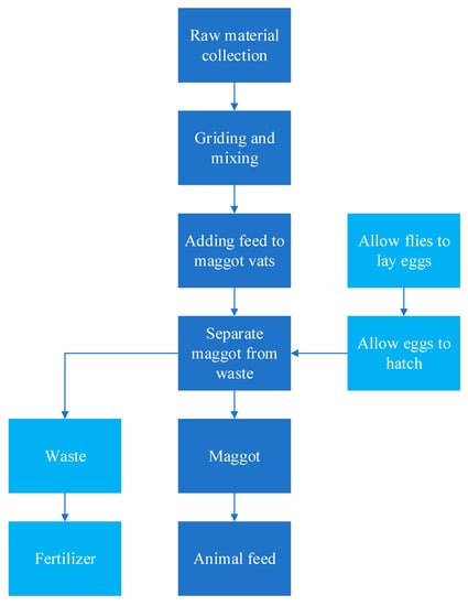 As a result, for the protection of human health and the environment in general it is critical to explore and develop readily available, cost-effective, and environmentally friendly technologies for the recovery of food waste. As one of the most valuable and limited resources, proper food waste management can also assist to safeguard water resources from pollution. Maggot production as animal feed stands to be among the relatively cost-effective approaches for food waste recovery [19,20,21]. Maggots can be defined as fly larvae, typically of the common housefly as well as the bluebottle species [22]. The production mechanism is that flies are attracted to food and other sorts of rubbish, they then lay their eggs on the rubbish, the latter eventually hatching into maggots [23]. Regrettably, the information on how maggot production can be a useful tool for food waste management is still scarce.