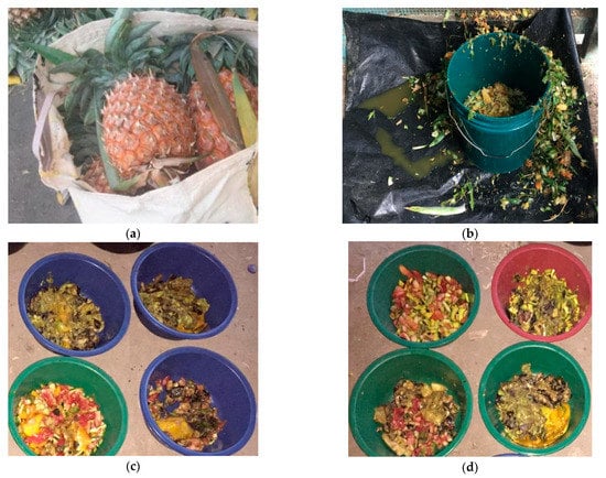 Summary of the material preparation processes (a) pineapple materials (b) grinding (c) mixing container without fly attractant (d) mixing container with fly attractant.